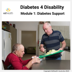 The Diabetes 4 Disability course modules are combined to give support workers the knowledge and skills required to support people with a disability to care for their diabetes. Support workers are encouraged to include the client in their self-care by focusing on what they can do.